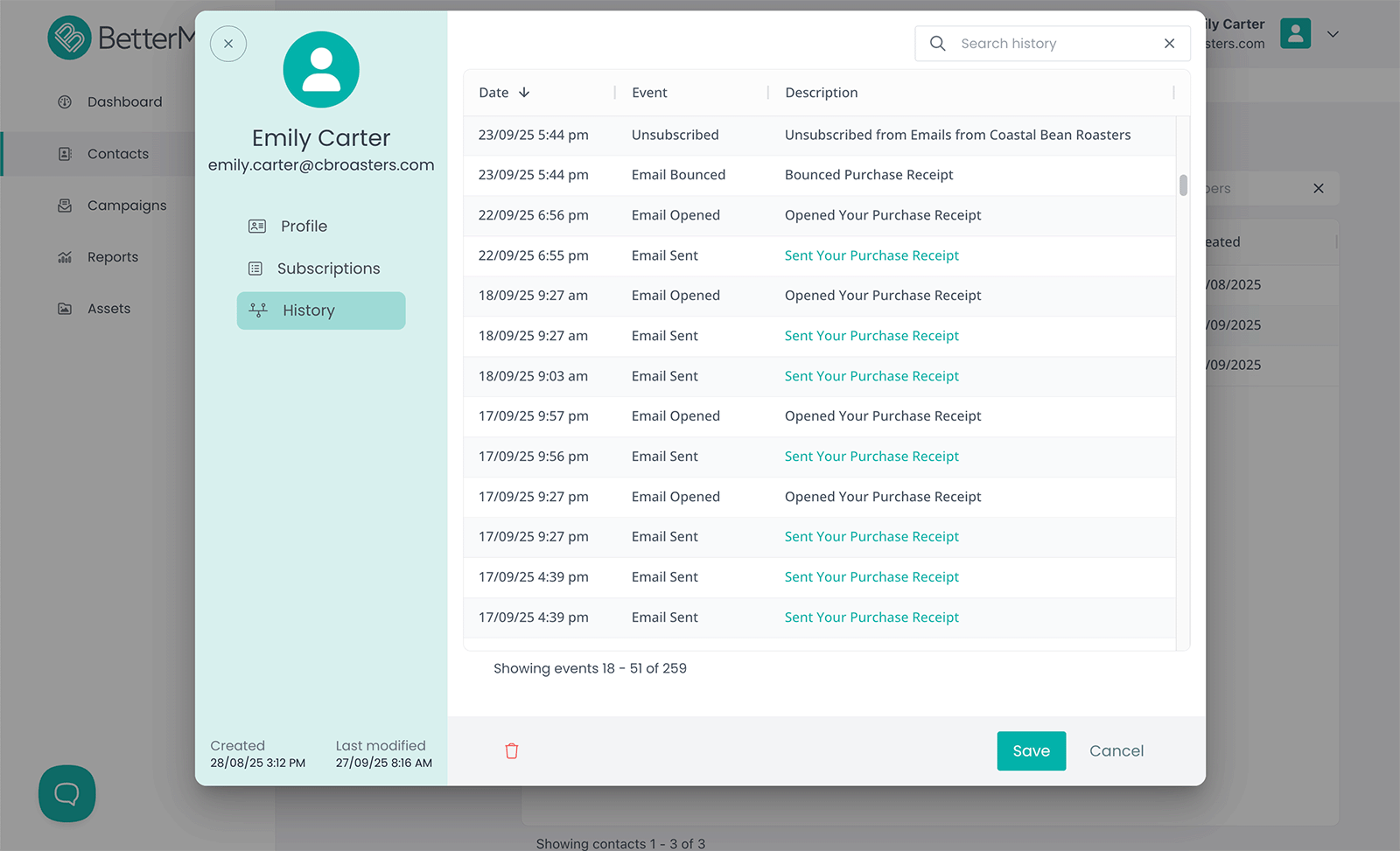 Access a complete history of each contact, including records of every email sent to them.