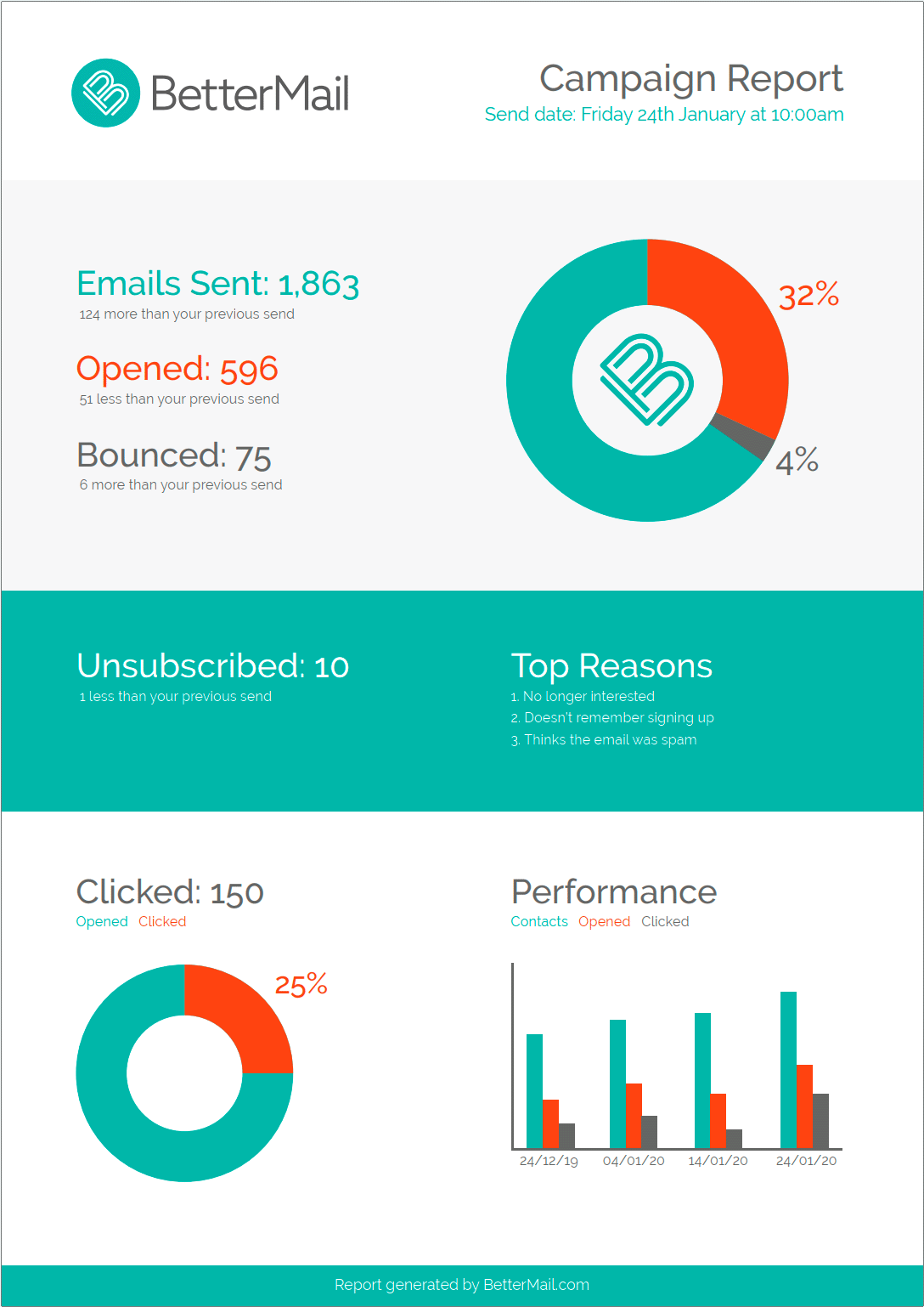 BetterMail gives you clear, actionable insights into every campaign. From at-a-glance dashboards to boardroom - ready custom reports, you'll always know how your email is performing.